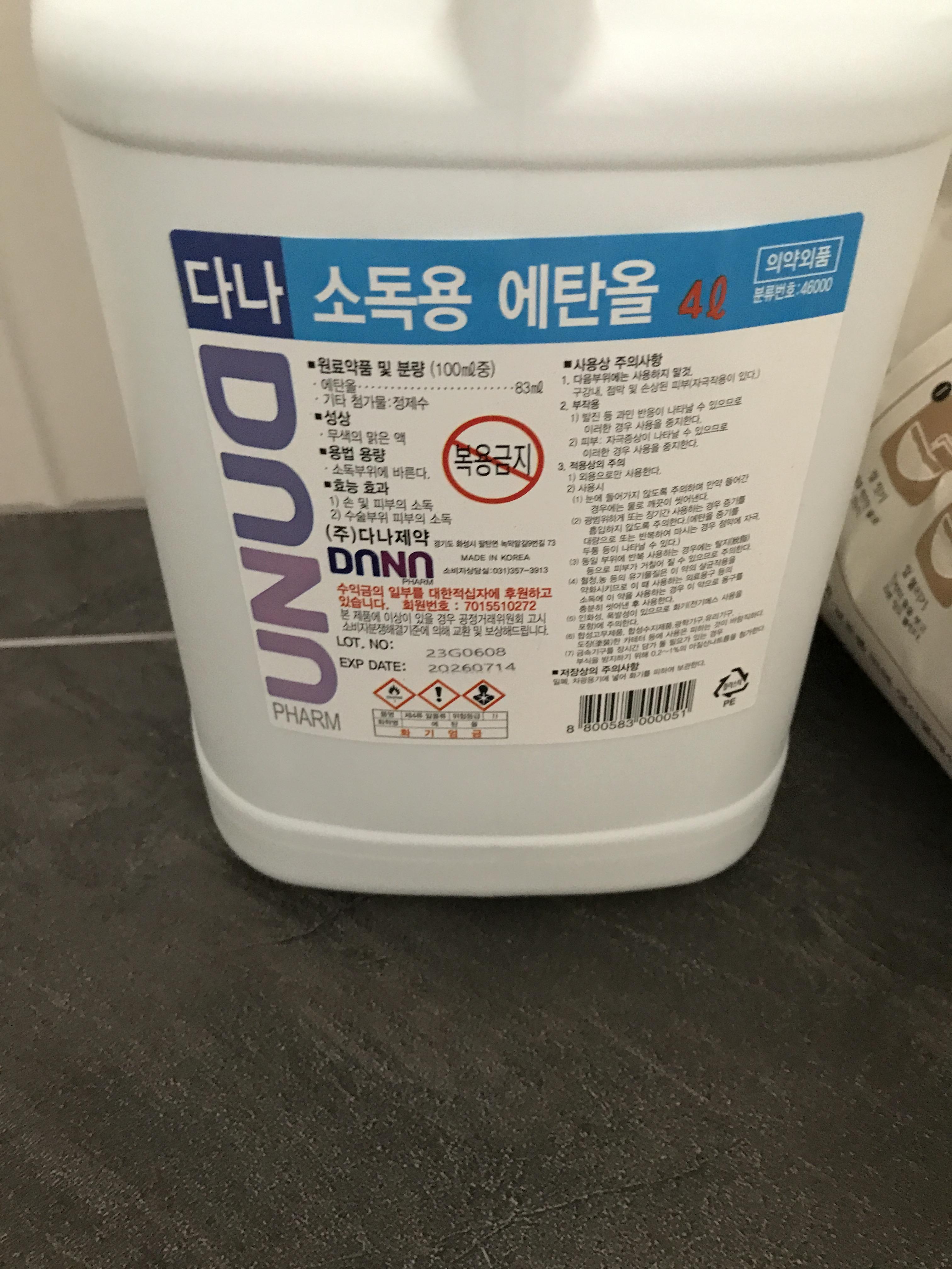 우리가 일반적으로 약국에서 파는 하얀 플라스틱 통에 파는 알코올이랑 똑같다고 생각하면 된다. 조금씩 사면 너무 적어서 금방 쓰게 되고 플라스틱 버리는 것도 일이고, 어차피 많이 쓸거 같아서 택배비 포함해서 12000원 정도에 구입한거 같다.